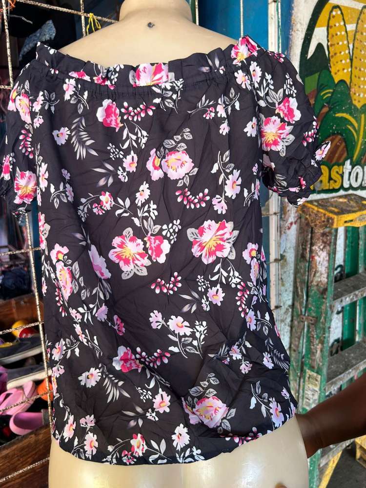 Comprar Blusa manga corta Talla S, Negro diseños en flores color naranja y rosada.