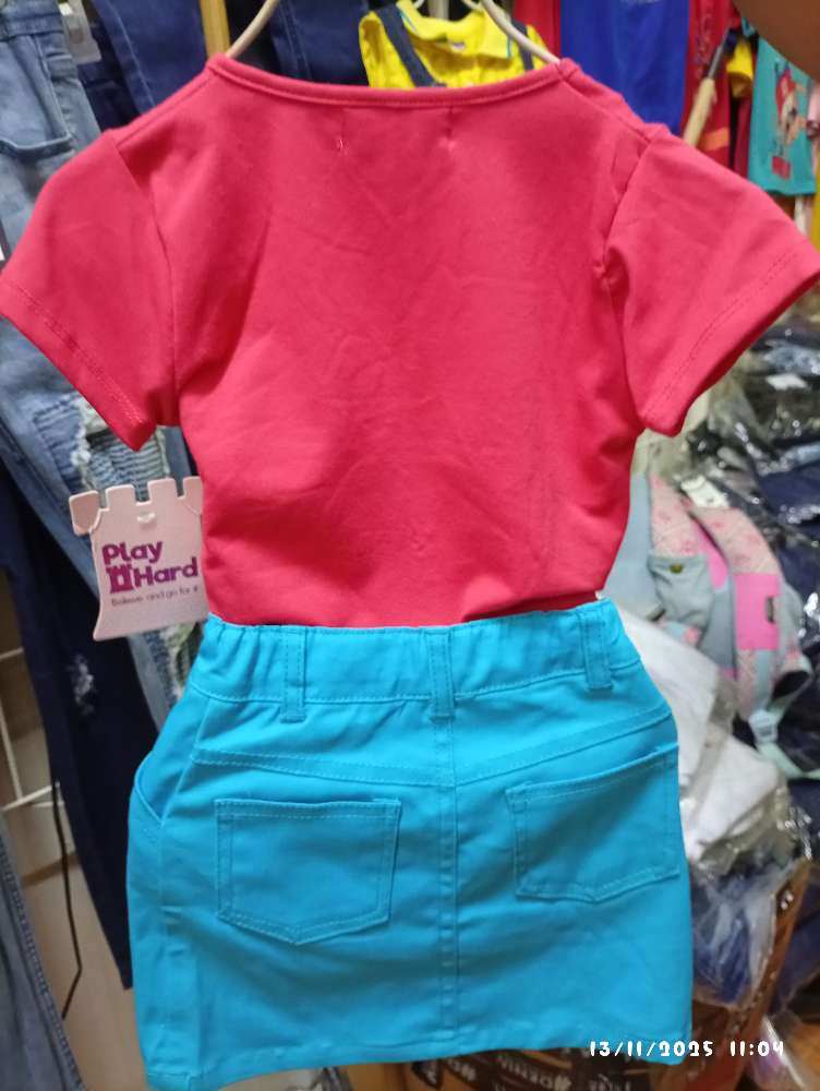 Comprar Overol talla 2, Camisa Rojo bajo con flor verde y celeste falda celeste